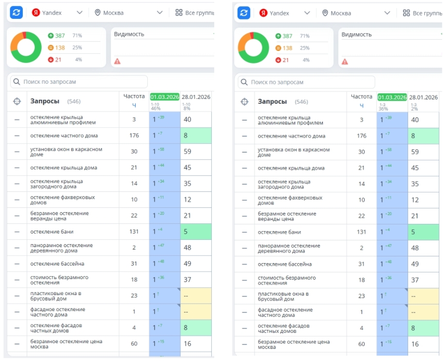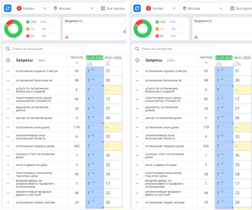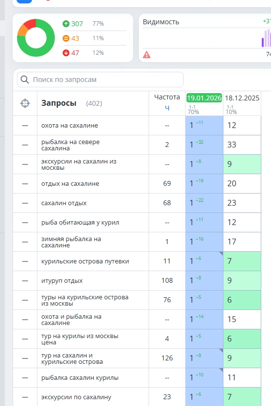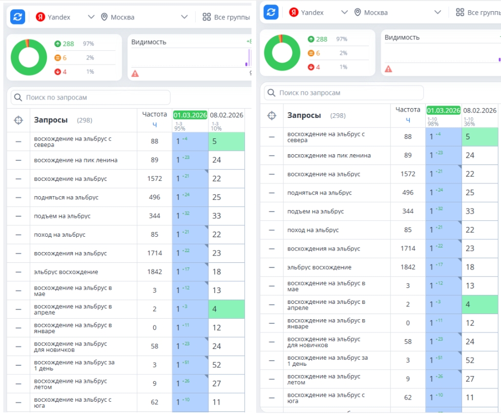 По эльбрусу. Это второй сайт клиента по Сахалину. Также туристическая тематика. Сайт старый, трастовый, никогда не видел пф. За 1 месяц работы февраль удалось поставить почти все запросы в топ. Видимость выросла по топ-10 с 36 до 98%. И по топ-3 с 10 до до 95%. То есть, за 1 месяц большая часть запросов встало в топ-3.