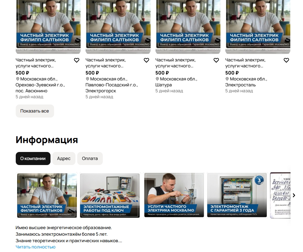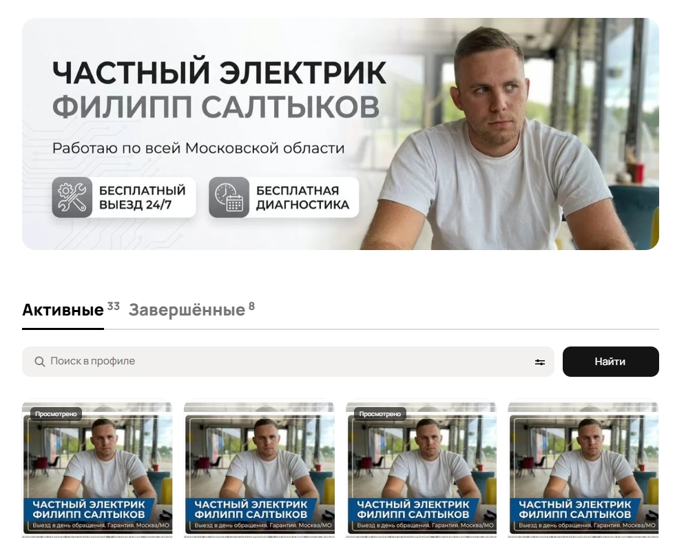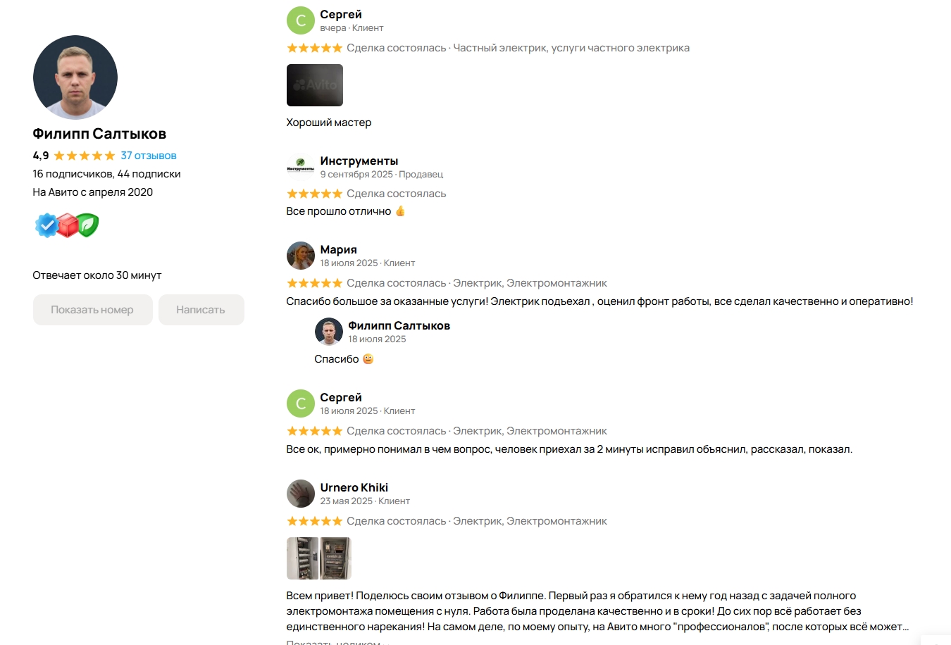 Своему другу электрику настроил с нуля Авито. У него было 1 слабенькое объявление и полностью пустой профиль. Но самый главный плюс — это отзывы, у него старый аккаунт с реальными отзывами. Его не устраивало малое количество заявок. Я настроил ему продающий профиль, подключил расширенную подписку, подключил автозагрузку. Сделал масштабирование на города РФ. Заявки он начал получать уже в день выполнения мной работы. Сейчас в день у него по 10-15 заявок (звонки + сообщения в профиль на Авито). От многих заявок уже начинает отказываться. Так происходит очень часто, когда мои клиенты начинают получать поток заявок и у них появляется выбор — какую работу брать, а от какой отказываться.