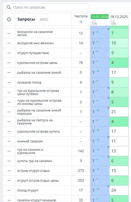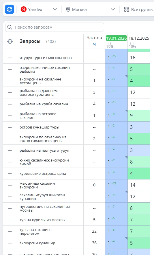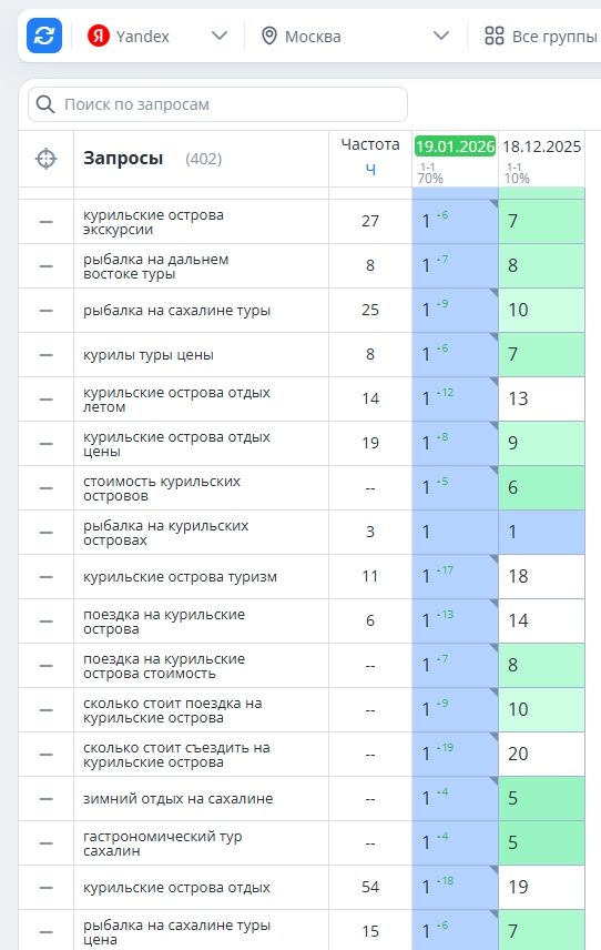 Результаты по Сахалину за счет работы пф. Рост запросов в 7 раз. С 10% в топ-10 до 70% за 1 месяц. Все самые важные запросы для клиента сейчас находятся в топе, как и хотел клиент, это было его ТЗ. Рост запросов начался в первого дня работы, уже через полчаса. На данный момент запросы продолжают расти, те которые за топ-10. И добавляем в работу новые, так как клиент расширяется каждый месяц, добавляются новые туры и экскурсии. Также на данный сайт настроена поисковая реклама и РСЯ, сайт находится на первых местах и в поисковой выдаче. На 80% задачи по данному сайту у нас закрыты, с февраля подключаем его другие сайты, начнем с Эльбруса, подключим также ПФ, ссылки для Гугла и контекстную рекламу. Кейс по Эльбрусу и по остальным его сайта — будут уже в других кейсах.
