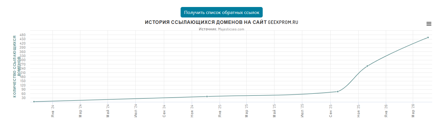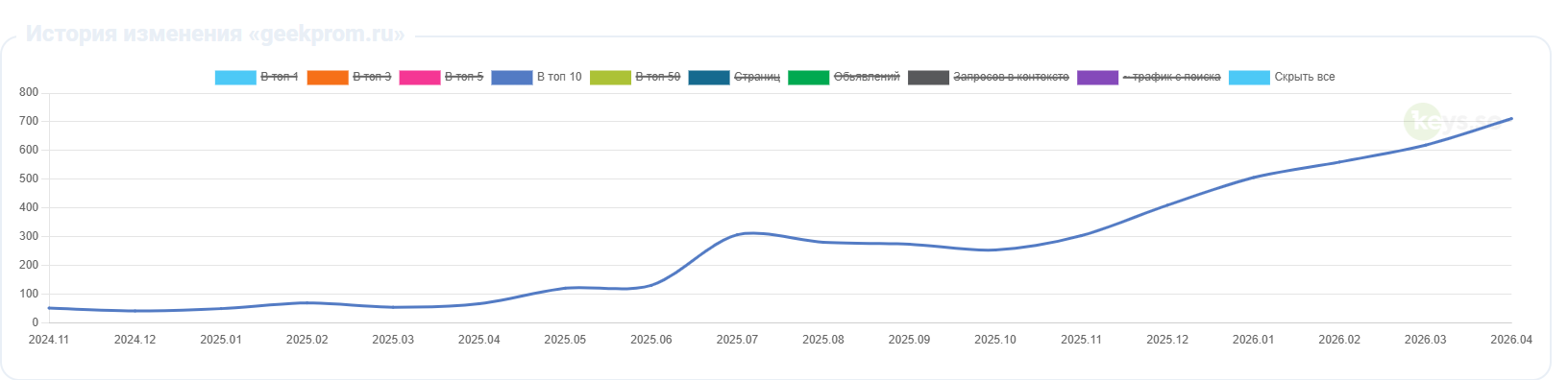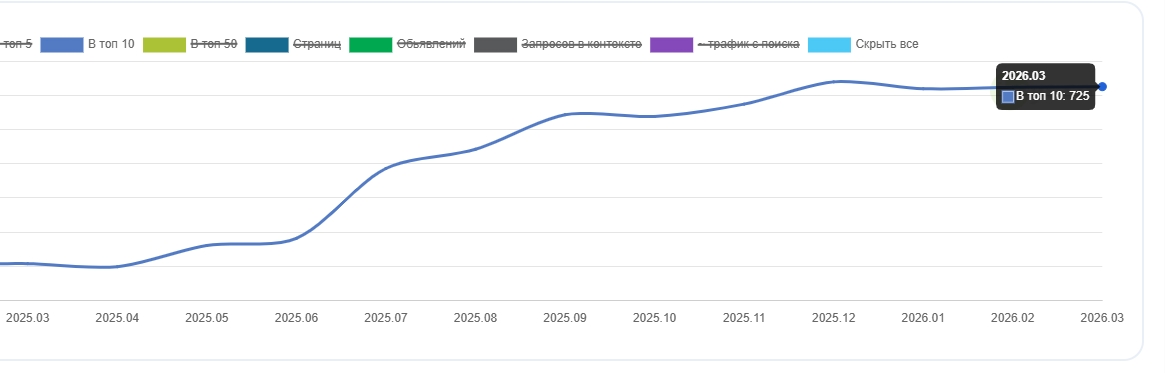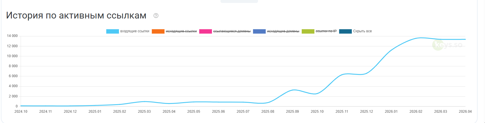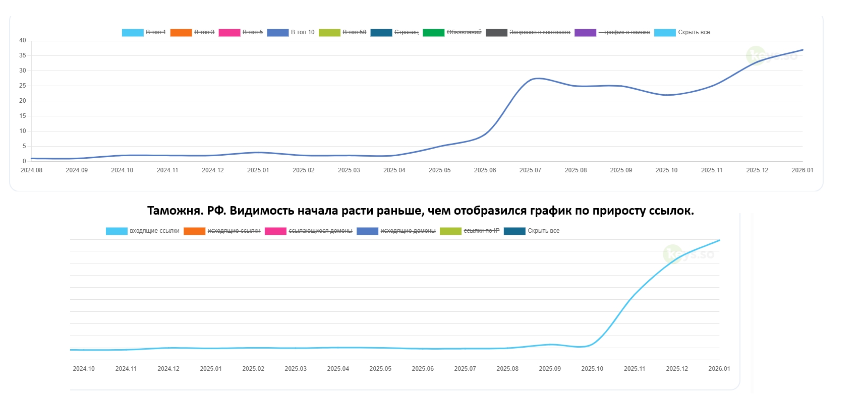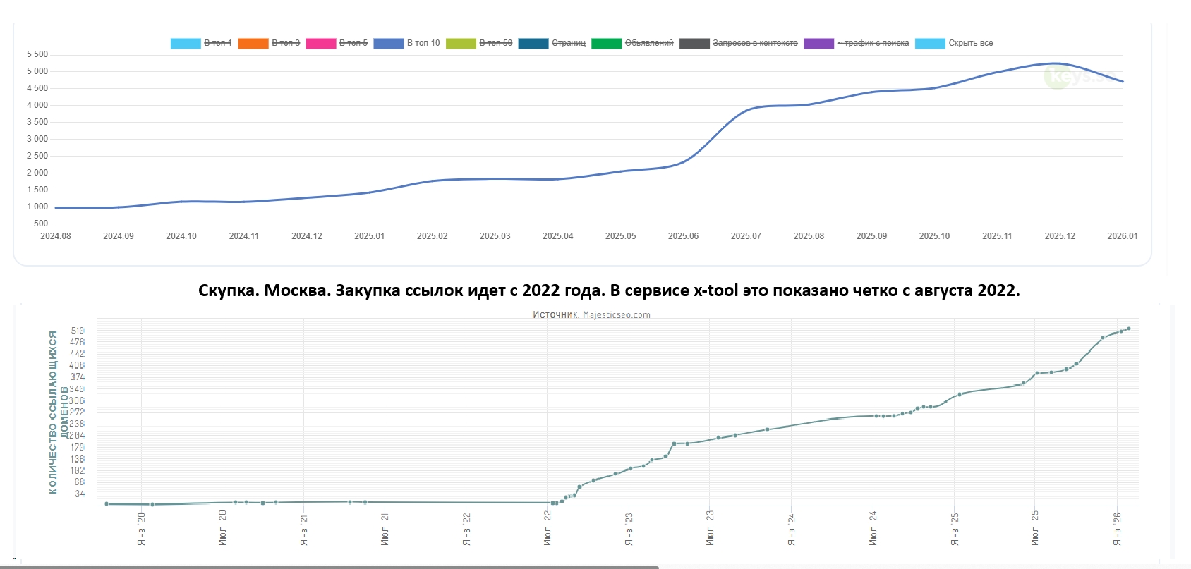 С данным клиентом работаем 11 месяцев чисто по ссылкам. Продвижение сайта в целом делает самостоятельно. Моя задача была в усилении трафика с Гугл. Каждый месяц ссылки закупались на бюджет 20 тысяч рублей. В работу входили такие виды ссылок: статейные с ггл, крауд, арендные, хрумер (ссылочная пирамида), и прочие виды ссылок. На кворке у меня это максимальный тариф, и для этого проекта такого бюджета хватило. За год есть видимый рост запросов по топ-10 в 3 раза (с 250 до 750 запросов). И график прироста ссылок отображается в 2 сервисах корректно (икс-тул и кейсо). Ниша не супер-конкурентная, если у вас такая же, то можете рассчитывать на такой же примерно срок и бюджет продвижения.