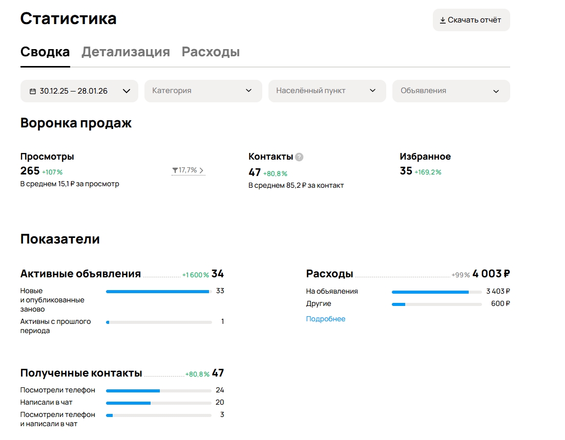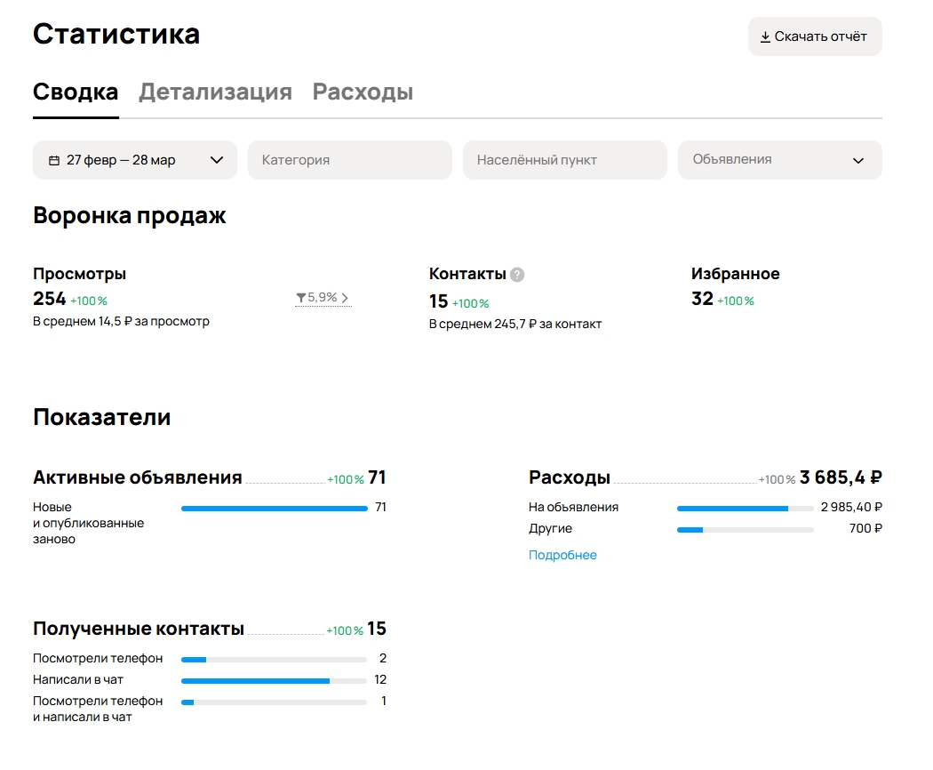 Все что остается делать теперь клиенту раз в месяц — это пополнять баланс на 10 тысяч рублей (оплата за просмотры), и продлевать объявления. Что занимает примерно 10-15 минут. И конечно, отвечать на звонки и сообщения клиентов.