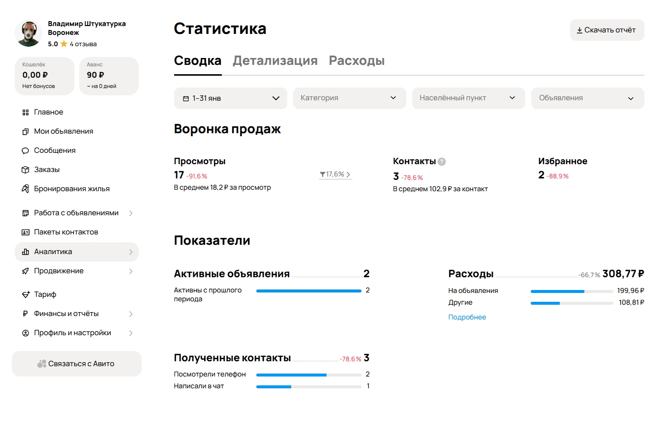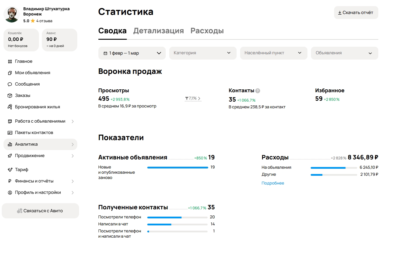 Клиент пришел в марте с запросов подключить Авито. У него основной источник заявок был это сарафан. Я скинул бриф на заполнение, получил всю информацию о бизнесе клиента. Также запросил города работы, портфолио, личную фото, и приоритетные цвета. За 2 я сделал: настройку профиля на основе брифа с графическим наполнением (баннеры пк, баннеры мобилки, аватарка и тд); создание продающего объявления и масштабирование на города Подмосковья. И уже на второй день была была получена первая заявка. Аккаунт полностью нулевой и без отзывов, клиент его сделал в момент, когда мне написал о продвижении на Авито.