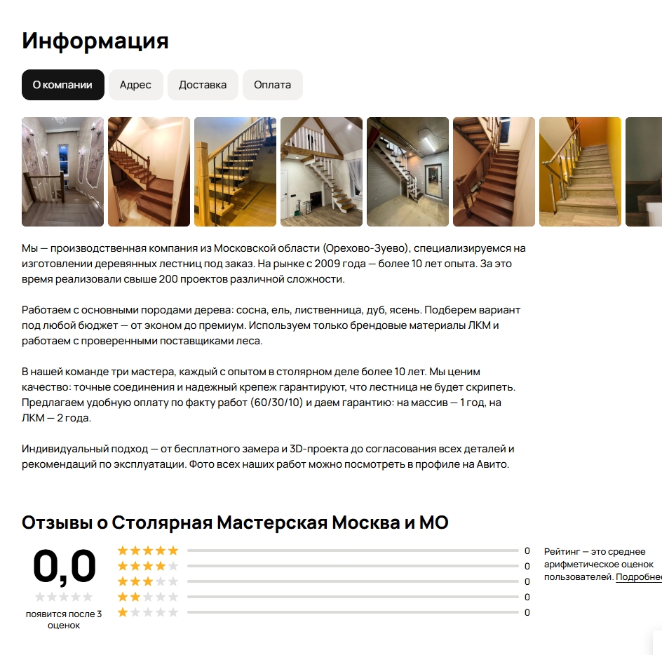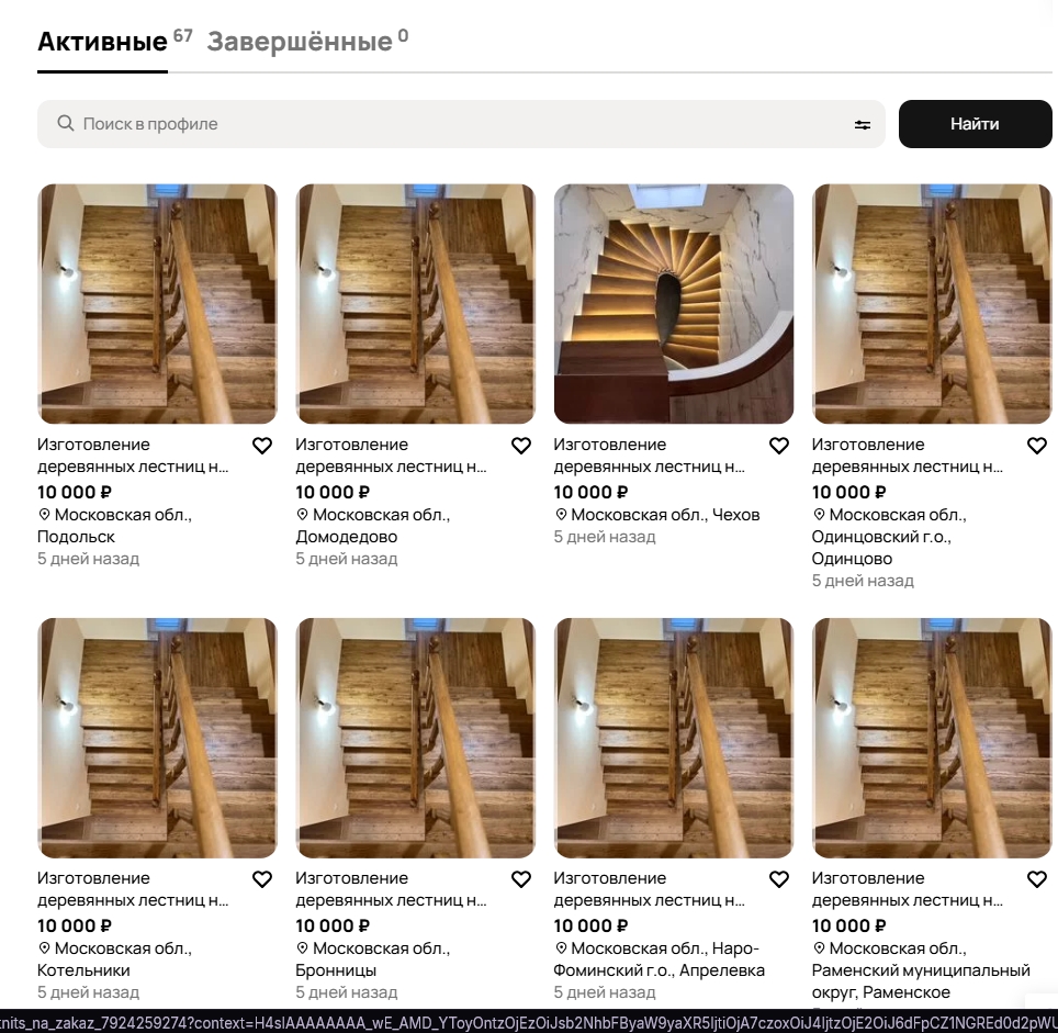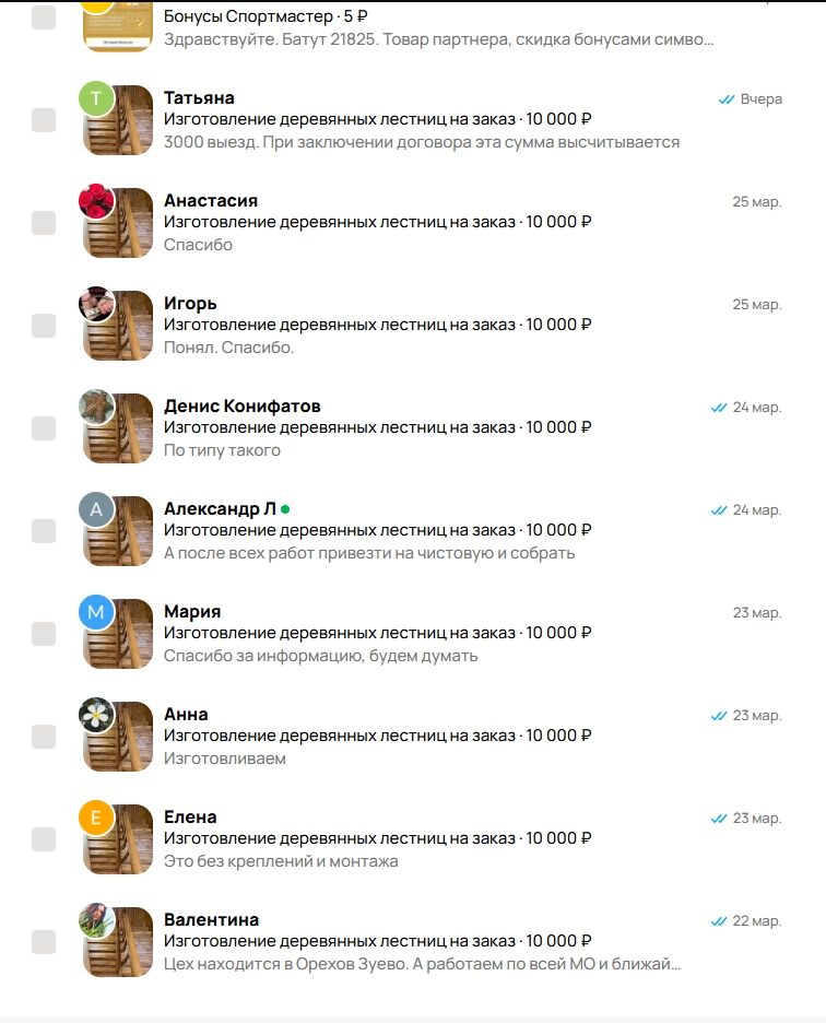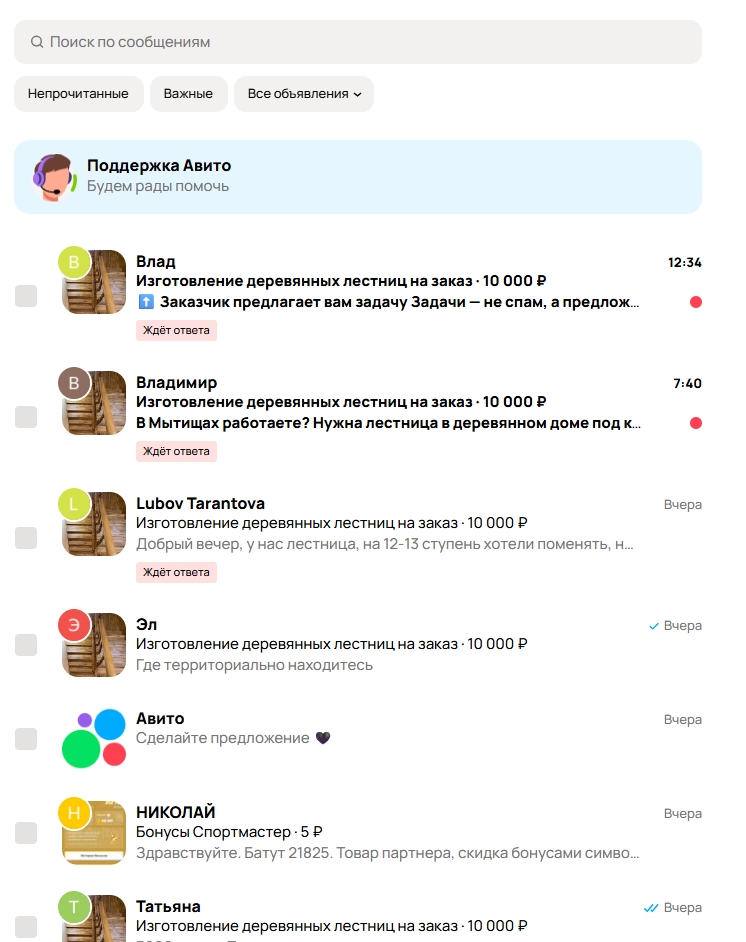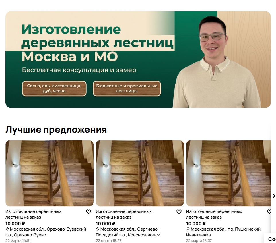 На само Авито было потрачено 3000 Расширенная подписка, и оплата просмотров — 600 рублей. На 3600 получено 15 заявок. Выгодно, так как лестницы у них стоят от 150-200 тысяч рублей.