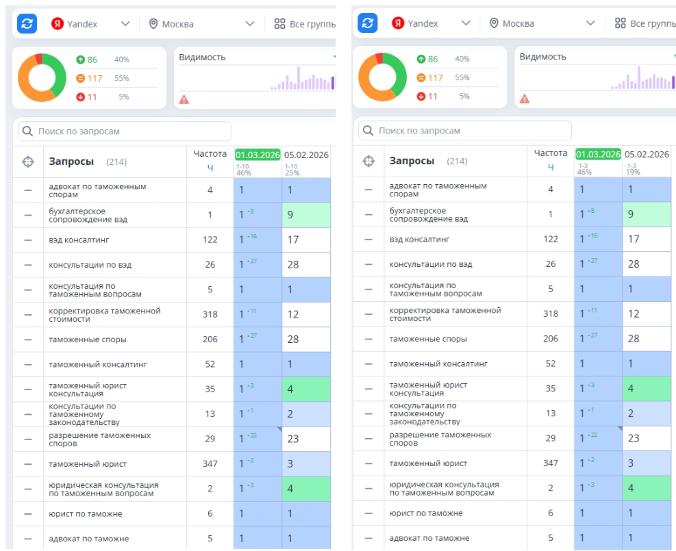 Таможенный юрист пришел снова на пф, спустя год отсутствия. За это время я занимался комплексными работами по его бизнесу, ему удалось накопить капитал, и мы восстанвоили работы по пф. Его цель — не скорость, а лиды. При работы по ПФ есть возможность крутить запросы на лиды. И как отметил клиент, количество лидов выросло, несмотря на то, что позиции вырсоли не так сильно, как в предыдущих кейсах. За 1 месяц по данному сайта видимость по топ-10 увеличилась с 25 до 46%. И по топ-3 с 19 до 46%.