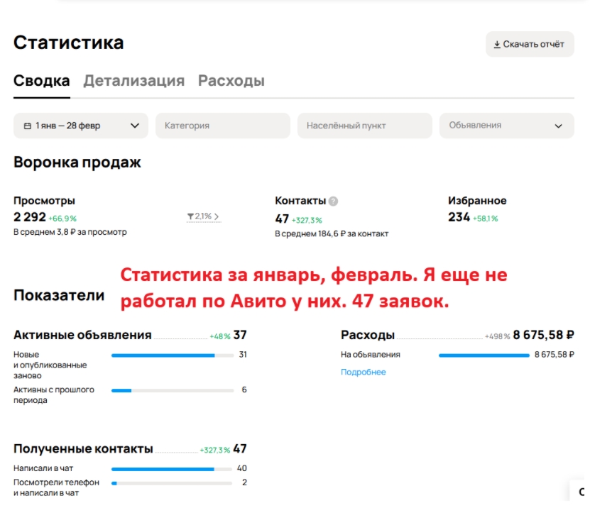 По данному клиенту работаем по SEO по нескольким сайтам, но ему поступила информация что его конкурент получает много заявок из Авито. В этот же день было принято развивать Авито. Получил доступы к аккаунту и приступил к работе. Перевел все объявления с товарной категории на услуги. Подключил Расширенную подписку, подключил оплату за просмотры. Отредактировал и оттимизировал уже существующие 30 объявлений. Добавил несколько своих по продающей структуре: фото, описания, преимущества, призыва к действию и тд. Сделал масшабирование на города. Итого получилось 214 объявлений, и заявки начали идти в этот же день. Через 1 неделю работы менеджер компании уже начал жаловаться что не справляется с потоком заявок. Работа выполнена. Да, траты увеличились, но они условно бесплатные, по сравнению с seo и Яндекс Директом, там заявки стоят космическиз денег, нет никакого сравнения с Авито.