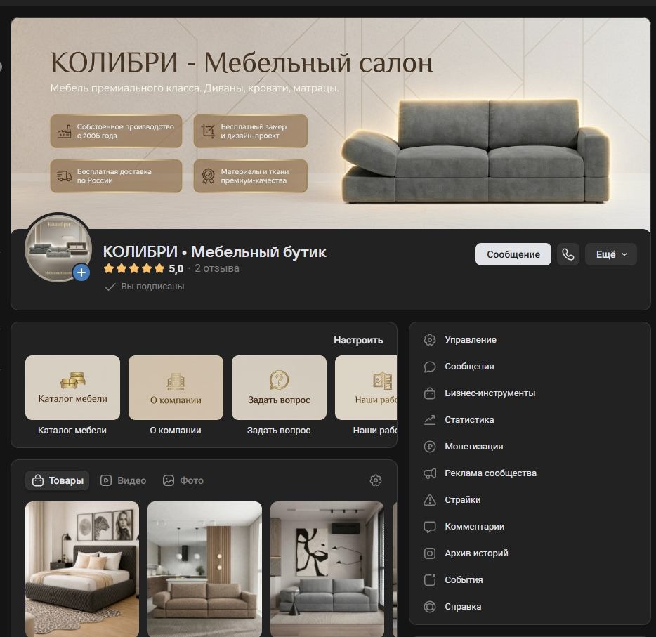 За март сделал 2 группы ВК под ключ с нуля. Мебель Колибри и для частника по остеклению балконов/лождий. Каждая группа создавалась с профессиональным дизайном и по чек-листу. На мебель настроен таргет, получено 7 заявок на тестовый бюджет 15000. Учитывая их премиальный сегмент, за заявку 2000 это хороший результат. По Балконам пока рекламу не запускали, напишу отдельный кейс.